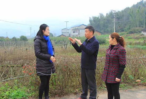 林善平代表(中)走訪(fǎng)回鄉的大學(xué)畢業(yè)生施穎( 左一),鼓勵她扎根山區,為山區發(fā)展貢獻聰明才智。攝影/ 王爭