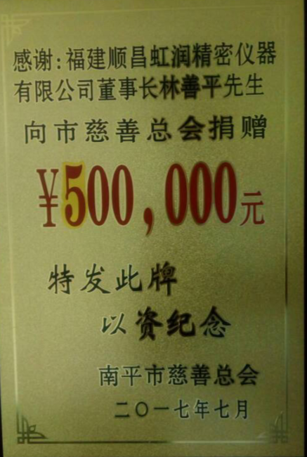2017年7月28日,南平市慈善捐贈大會(huì )暨市慈善總會(huì )換屆會(huì )議在南平市委舉行,福建順昌虹潤董事長(cháng)林善平再次當選為南平市慈善總會(huì )第三屆理事會(huì )副會(huì )長(cháng),這也是林善平董事長(cháng)第三次當選此職。同時(shí),在本次慈善捐贈大會(huì )上,他再次向市慈善總會(huì )捐款50萬(wàn)元。他表示,他還將一如既往,繼續加大對社會(huì )公益事業(yè)的支持力度,積極投身公益和慈善事業(yè),為南平市的慈善事業(yè)作出更大的貢獻。目前,林善平董事長(cháng)各項公益捐款累計已達1000余萬(wàn)元。