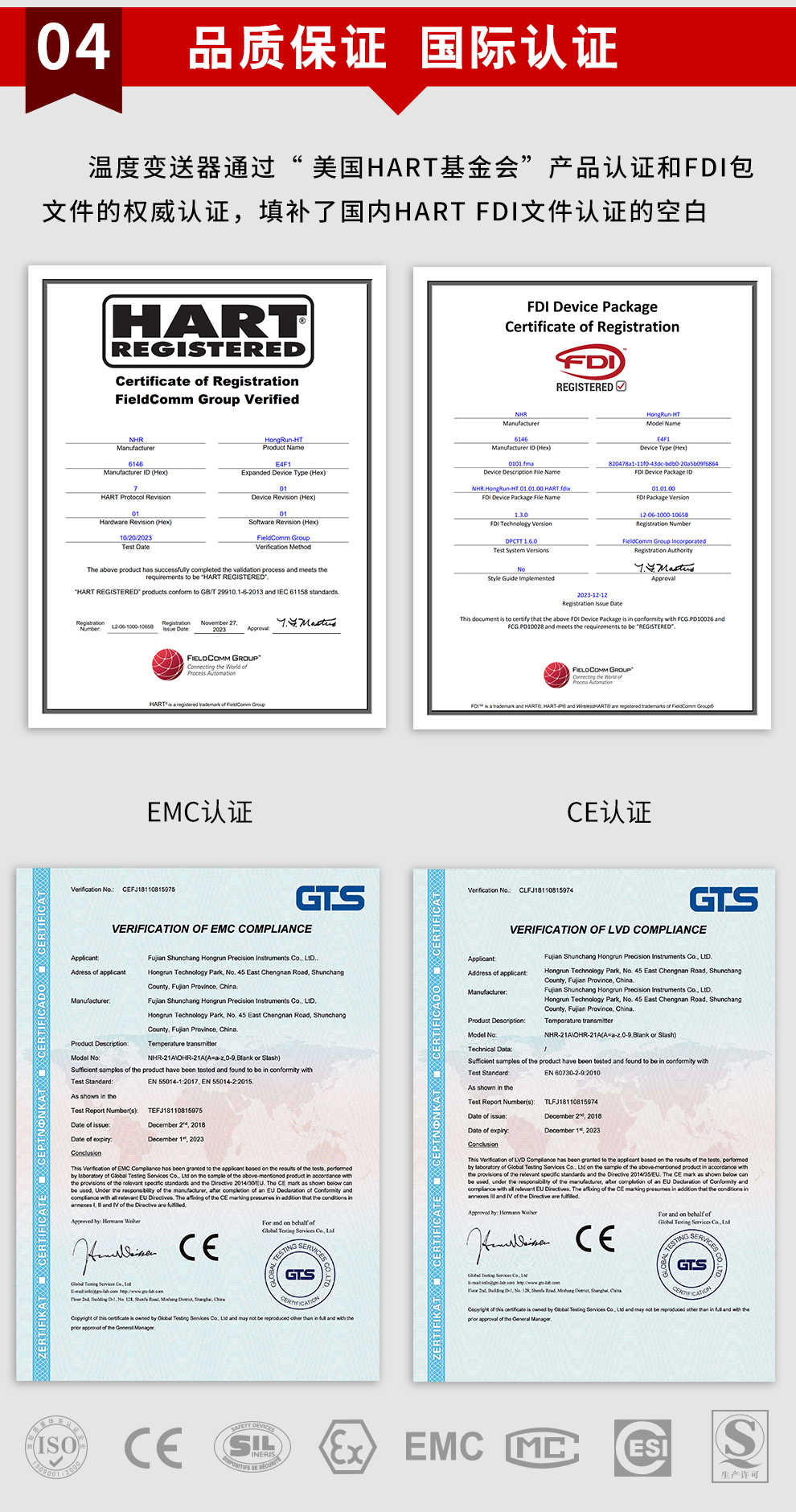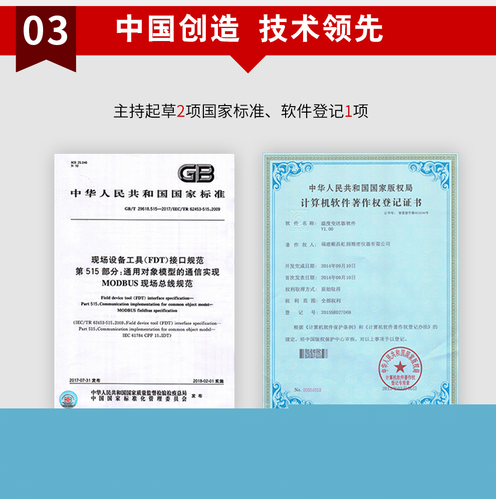 虹潤公司是專(zhuān)業(yè)生產(chǎn)溫度變送器的國家專(zhuān)精特新“小巨人”企業(yè)。生產(chǎn)的現場(chǎng)顯示隔離溫度變送器,具有可修改輸入信號類(lèi)型,測量精度高,穩定性好,帶HART或RS485通訊計等特點(diǎn)。該產(chǎn)品不僅通過(guò)德國萊茵 CE 認證與 SIL 功能安全認證,還獲得具備減震抗干擾能力的溫度變送器、信號隔離器、一種二端子模塊、無(wú)源信號隔離器等3項國家發(fā)明專(zhuān)利。主持起草物聯(lián)網(wǎng)智能溫度儀表、現場(chǎng)設備工具(FDT)接口規范、工業(yè)過(guò)程測量和控制系統用溫度變送器等3項國家標準,以及通信系統多通道數據采集控制終端規范軍用標準。參與國際5G標準制定,取得高精度溫度變送器等3項相關(guān)軟件著(zhù)作權。產(chǎn)品廣泛應用于石油、化工、電力、冶金、制藥、食品、水處理等各種工業(yè)領(lǐng)域。