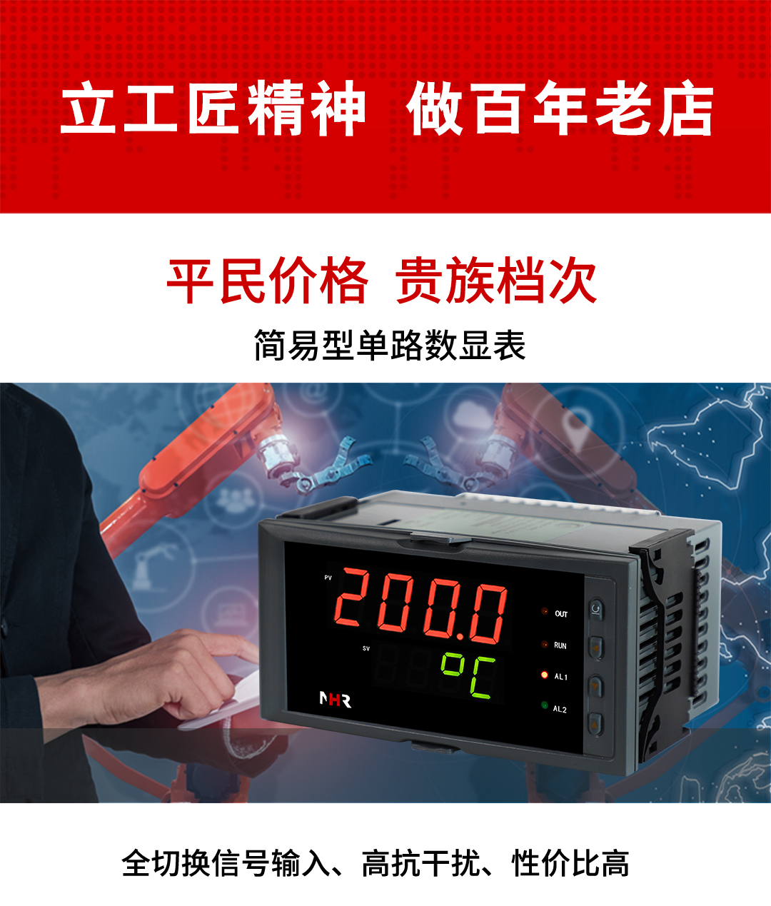虹潤公司是專(zhuān)業(yè)生產(chǎn)數顯表的國家專(zhuān)精特新“小巨人”企業(yè),生產(chǎn)的簡(jiǎn)易型數字顯示控制儀,具有全切換信號輸入,多種外形尺寸,高抗干擾,輸入/輸出/電源三隔離,性?xún)r(jià)比高等特點(diǎn)。該產(chǎn)品不僅通過(guò)德國萊茵 CE 認證,還獲得巡回檢測顯示方法及裝置、儀表殼體等2項國家發(fā)明專(zhuān)利,主持起草工業(yè)過(guò)程控制系統用模擬輸入兩位或多位輸出儀表、物聯(lián)網(wǎng)智能溫度儀表通用技術(shù)條件等2項國家標準,以及通信系統多通道數據采集控制終端規范軍用標準,參與國際5G標準制定,取得簡(jiǎn)易數顯儀表等3項相關(guān)軟件著(zhù)作權。產(chǎn)品廣泛應用于電力、石化、冶金、化工、造紙、食品、輕工、制藥、熱處理、水處理、機械配套等各種工業(yè)現場(chǎng)。