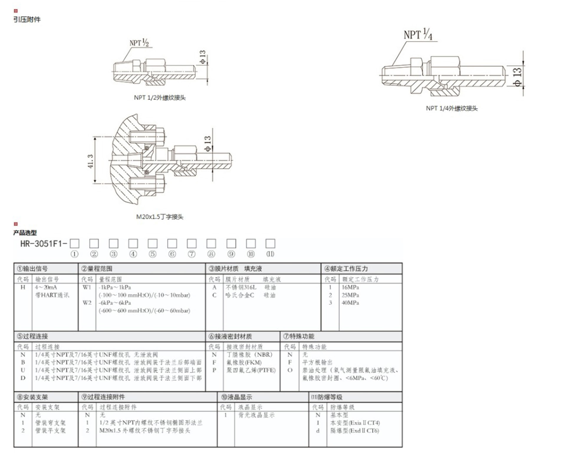 HR-3051F1智能單晶硅微差壓變送器能準確的測量差壓,并把它轉換成4~20mADC的輸出信號。該變送器可通過(guò)三按鍵本地操作,或通用手操器、組態(tài)軟件、以及手機APP遠程操作,在不影響4~20mA DC的輸出信號的同時(shí),進(jìn)行顯示與組態(tài)。