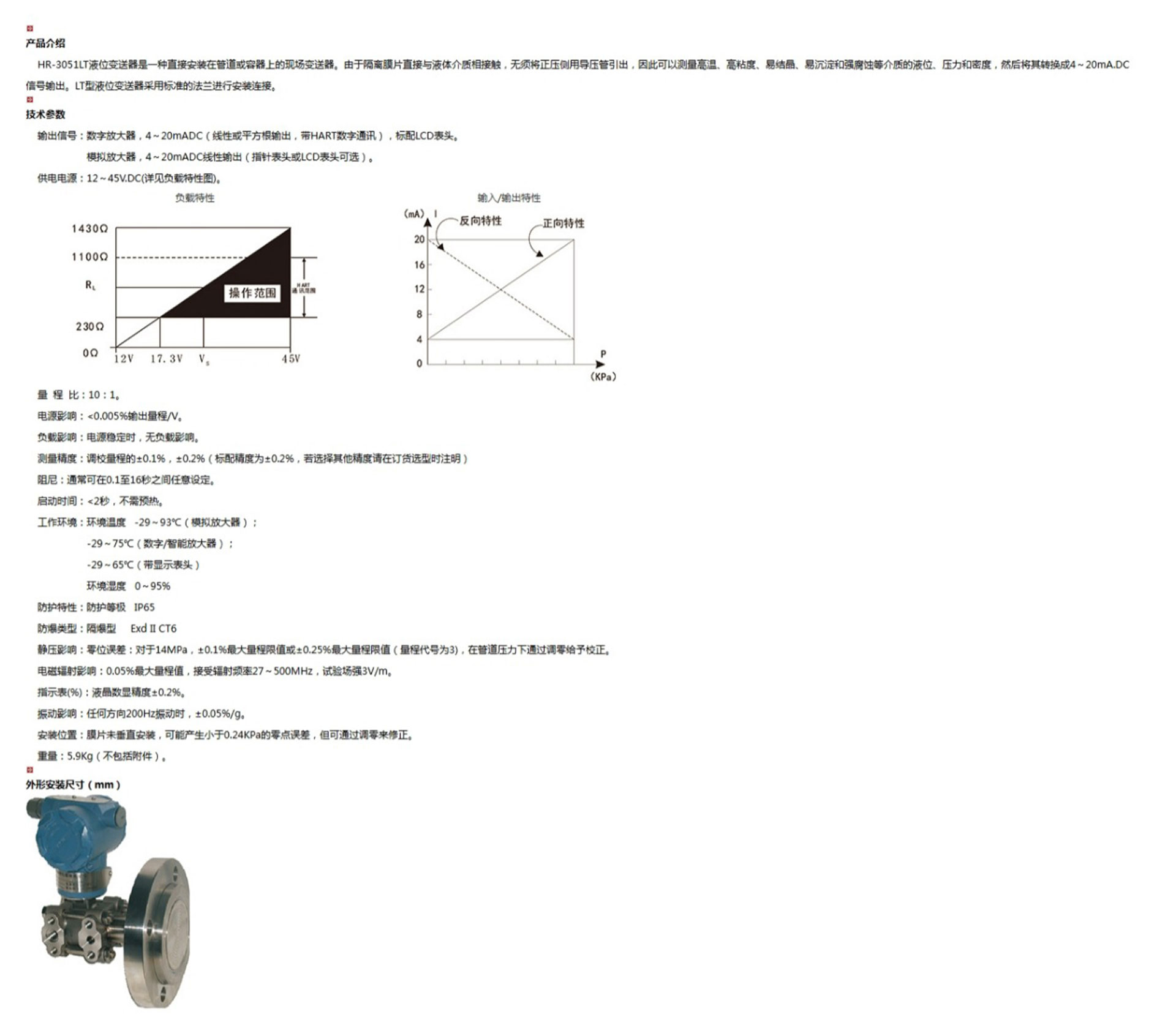 HR-3051LT液位變送器是一種直接安裝在管道或容器上的現場(chǎng)變送器。由于隔離膜片直接與液體介質(zhì)相接觸,無(wú)須將正壓側用導壓管引出,因此可以測量高溫、高粘度、易結晶、易沉淀和強腐蝕等介質(zhì)的液位、壓力和密度,然后將其轉換成4~20mA.DC信號輸出。